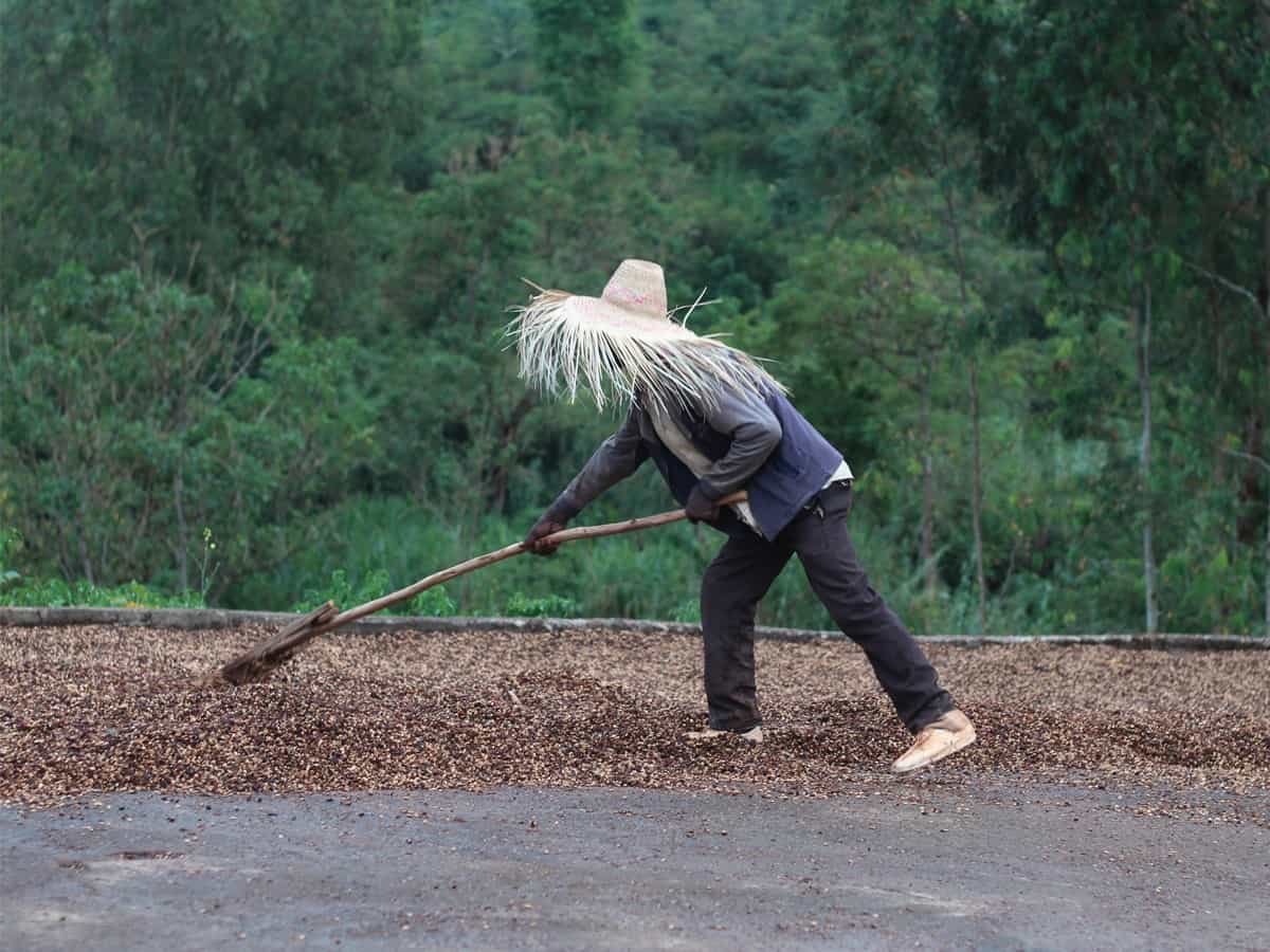 En la cosecha, sólo se recogen las cerezas rojas completamente maduras. A continuación, se seleccionan a mano en tanques de flotación antes de secarlas cuidadosamente durante 18-20 días en lechos africanos (elevados), con un aumento gradual del grosor, empezando por el grosor de una sola cereza y terminando en 10 cm durante los dos últimos días de secado.